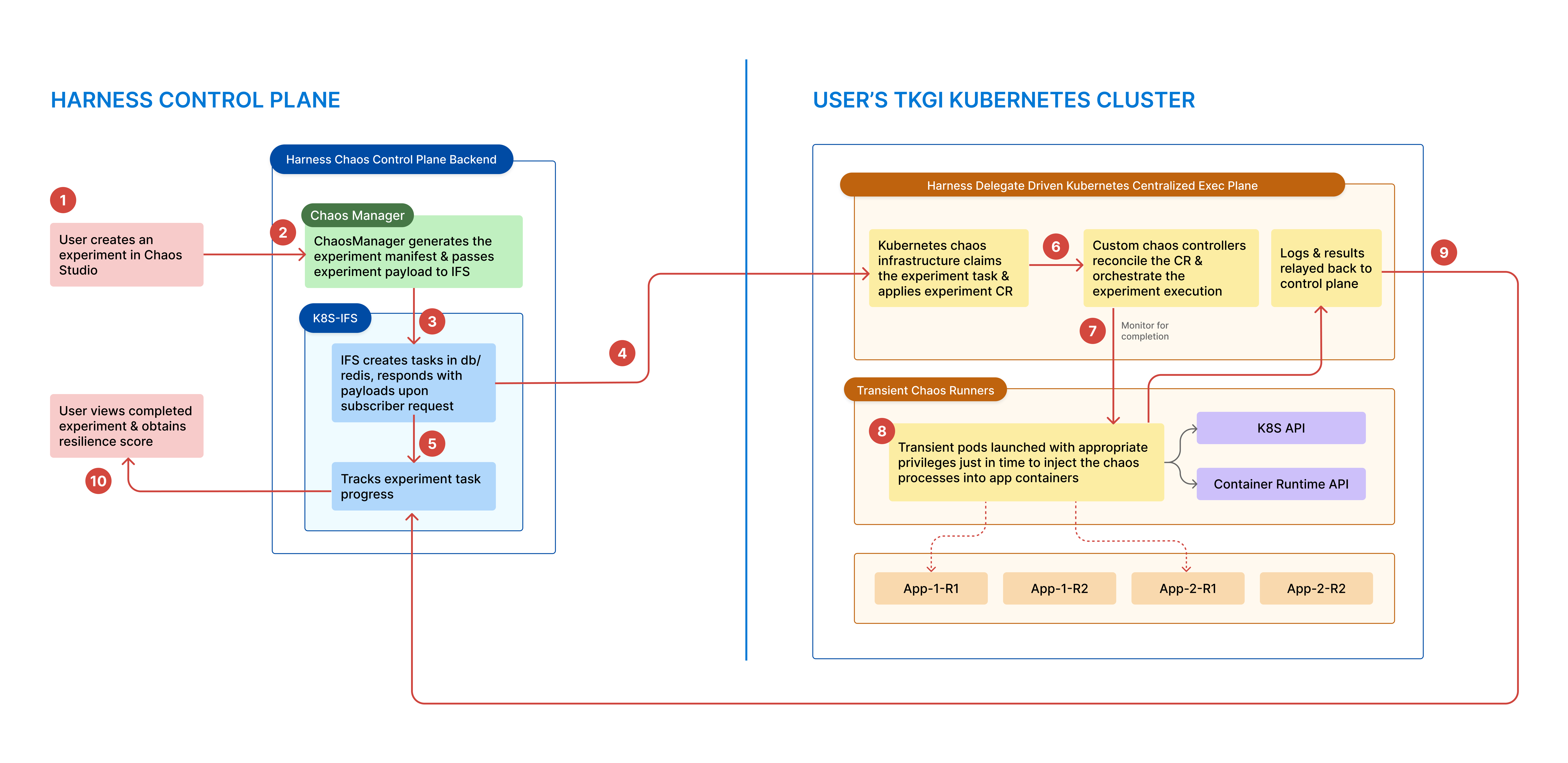 The diagram below describes the interaction between the Harness control plane and the TKGi Kubernetes cluster.