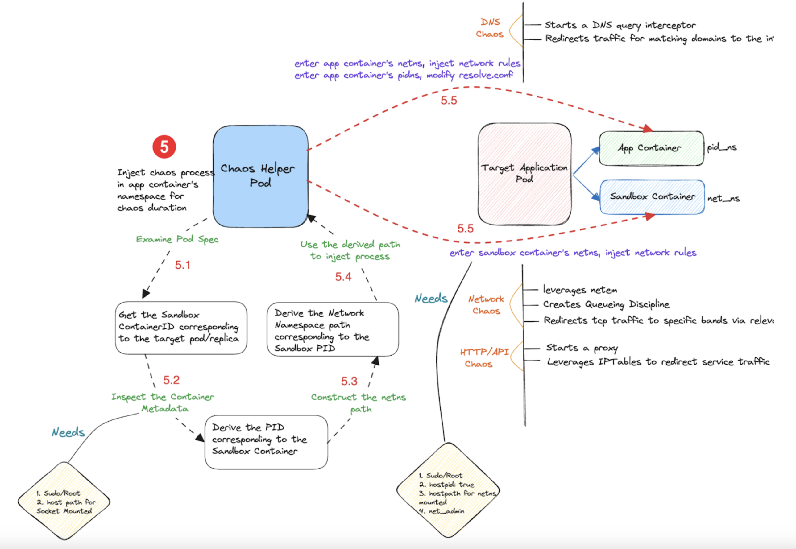 - The chaos actions typically invoke either or a combination of the Kubernetes API, container runtime API, and cloud APIs.