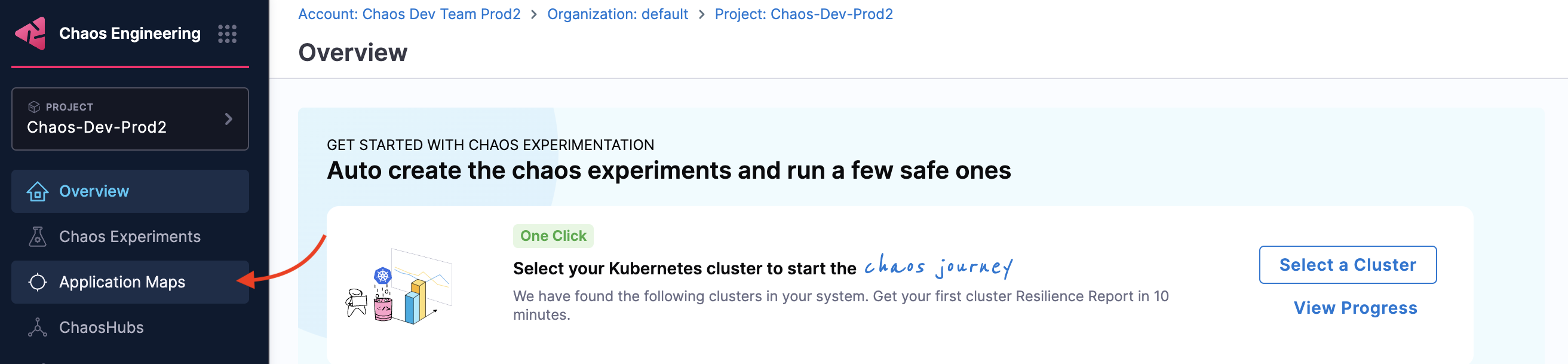 • To view chaos-enabled experiment map, navigate to Chaos module and select Application Maps.