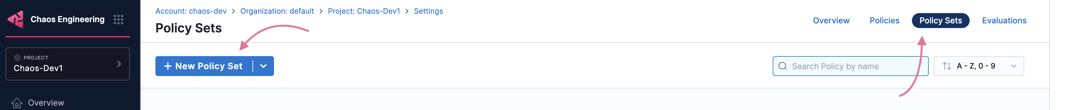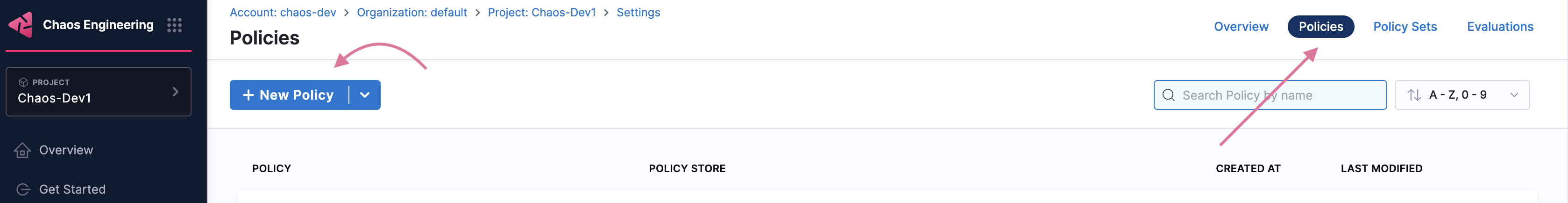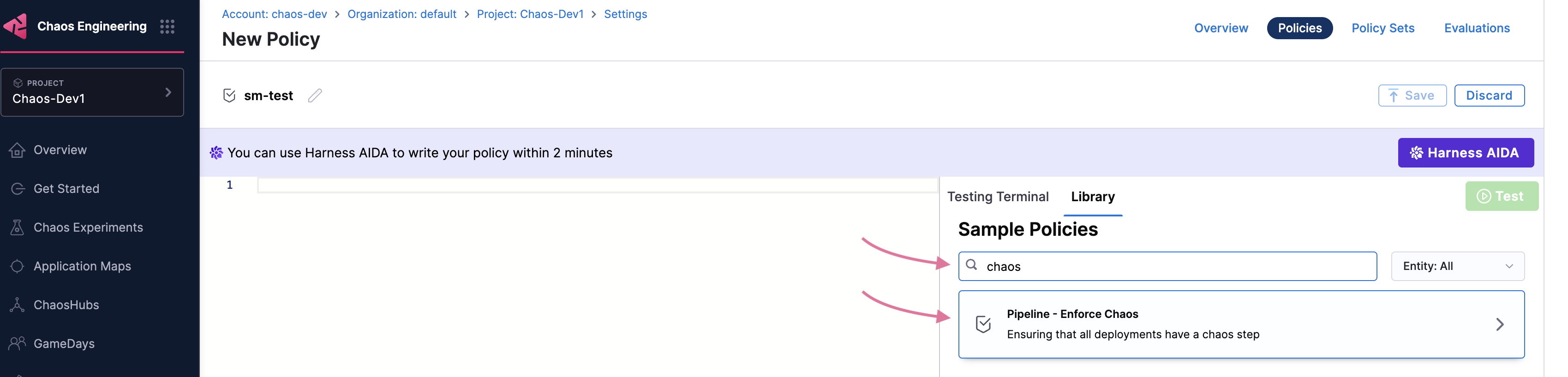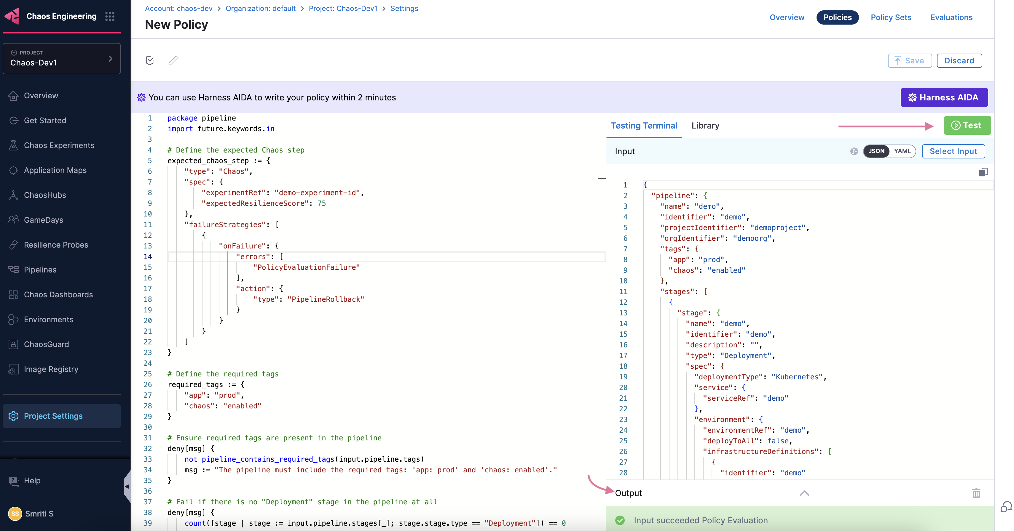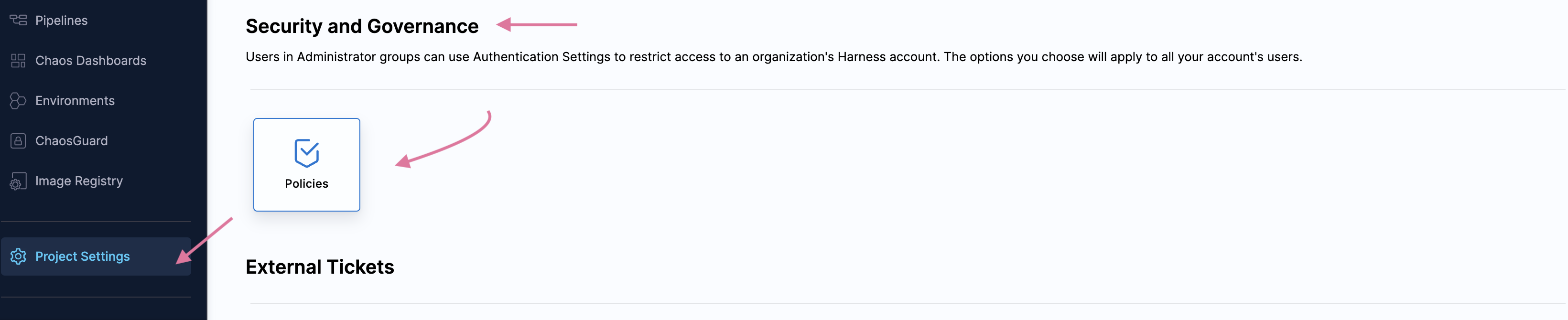2. To apply an OPA policy to your pipeline, go to Chaos module -> Project Settings. Under Security and Governance, select Policies.