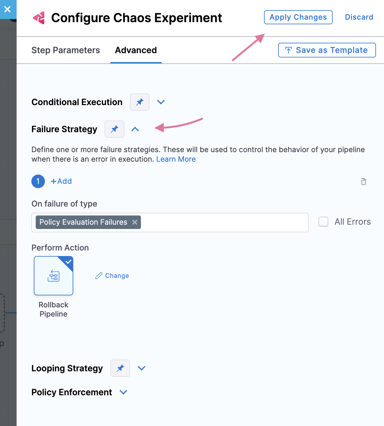 1. The OPA template contains a failure strategy field which is mandatory, that is, To apply a failure strategy in the template, go to Continuous Integration module, select your pipeline and the step where chaos is used. Go to Advanced modal. Click Failure Strategy and select the strategy. Click Apply Changes.