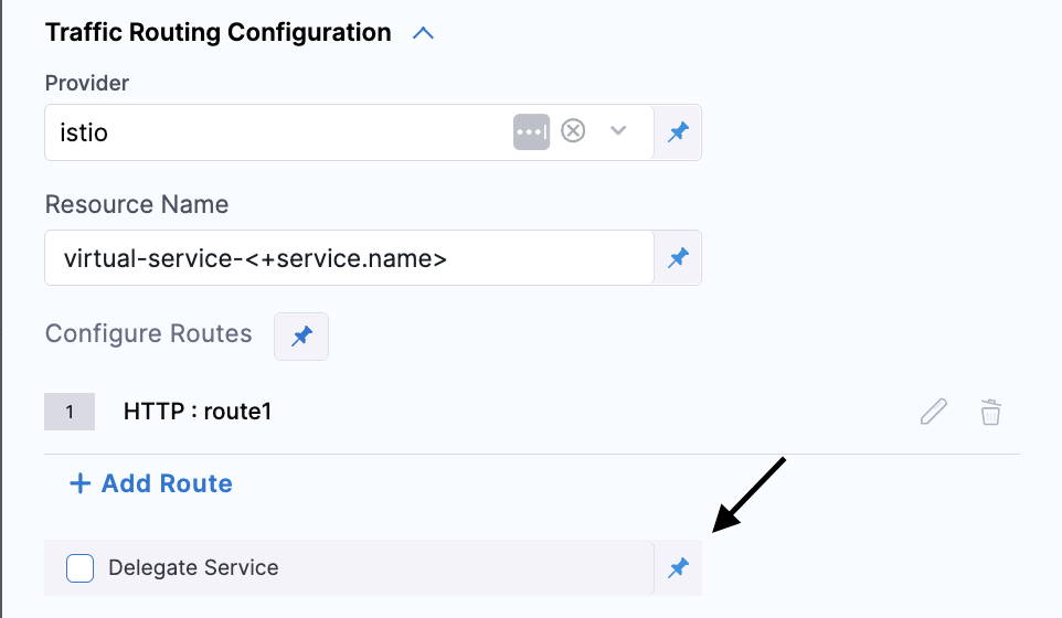 - New Config: Select this option if you want to specify a new configuration for traffic routing in this step. If configuring this in a BlueGreen deployment step or a Canary step this option is implicitly assumed. This option will create a new resource(s).