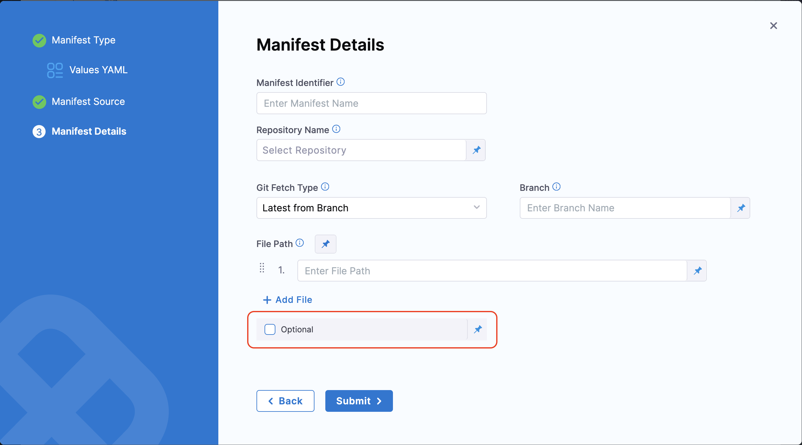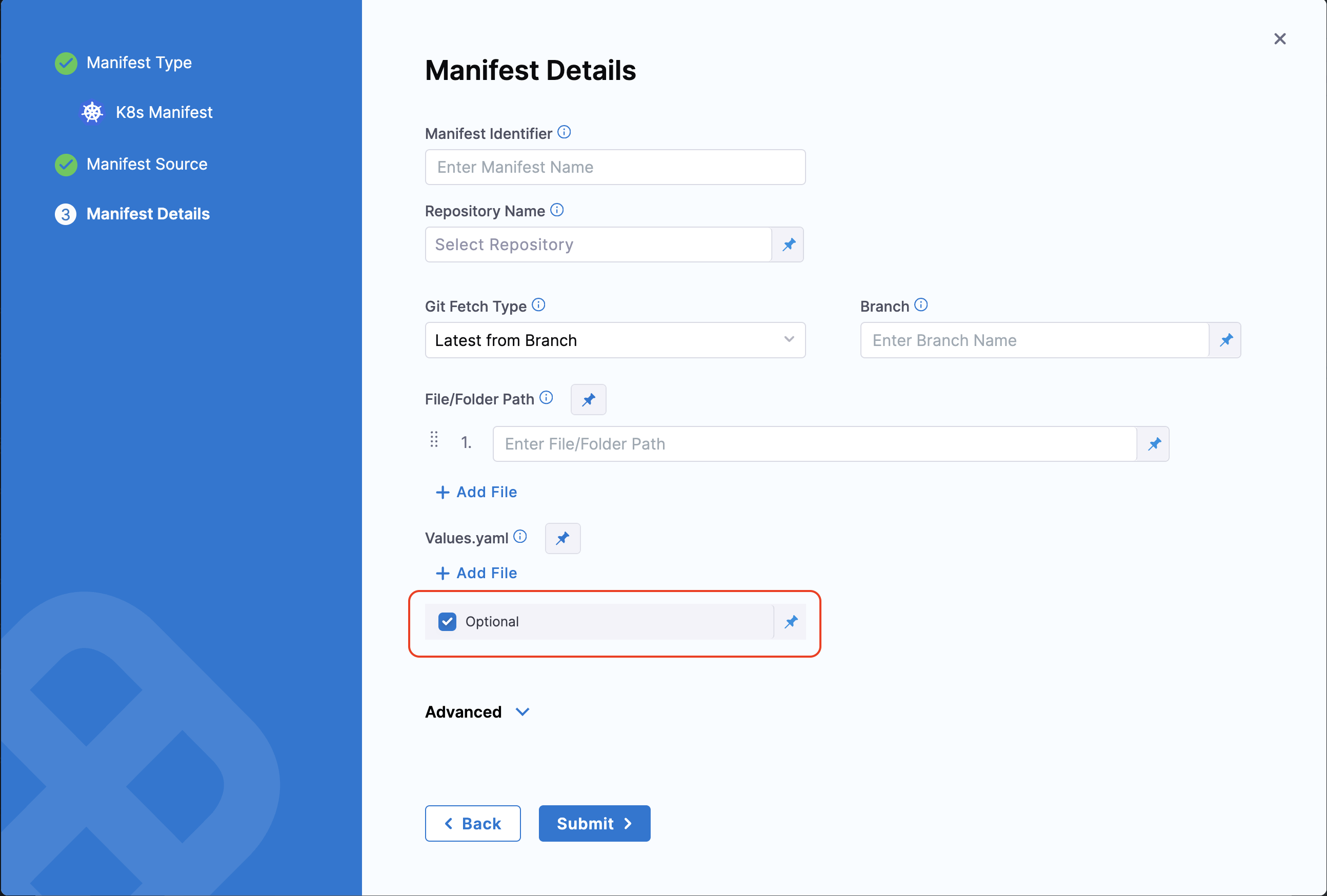 Here is a sample of how the manifest would look when this checkbox is enabled. The optionalValuesYaml will be set to true.