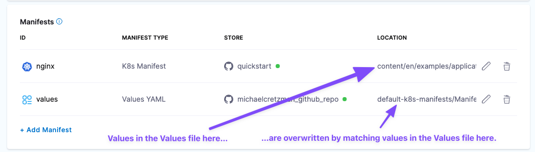 Here's a YAML example for a service with manifests hosted in Github and the nginx image hosted in Docker Hub.Example