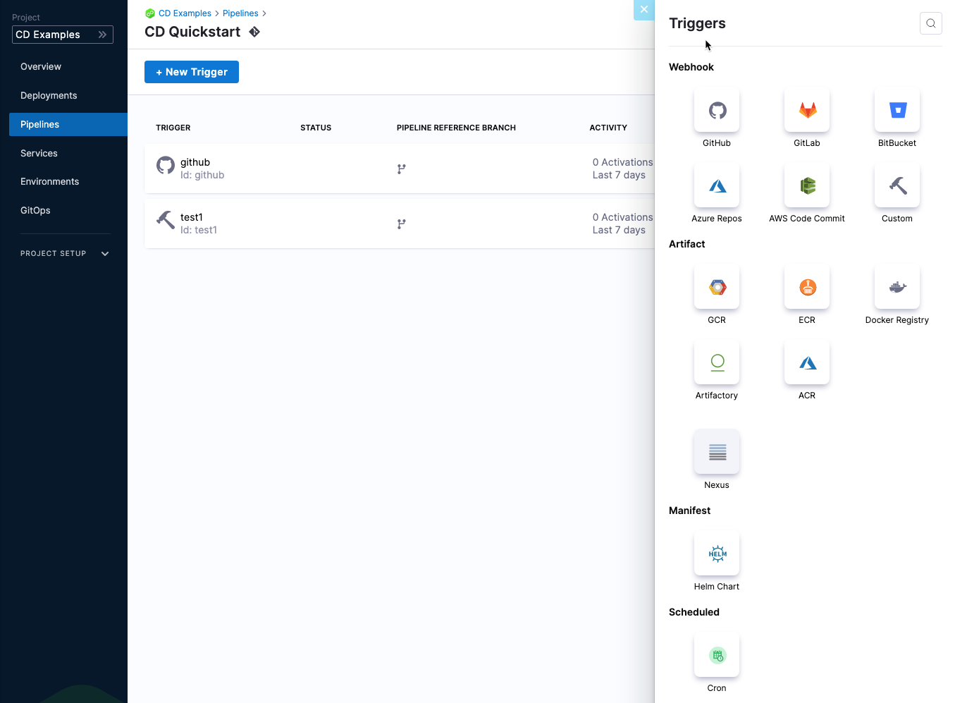 Automate the execution of a Pipeline in response to changes in manifests/specs, artifacts, or on a schedule: