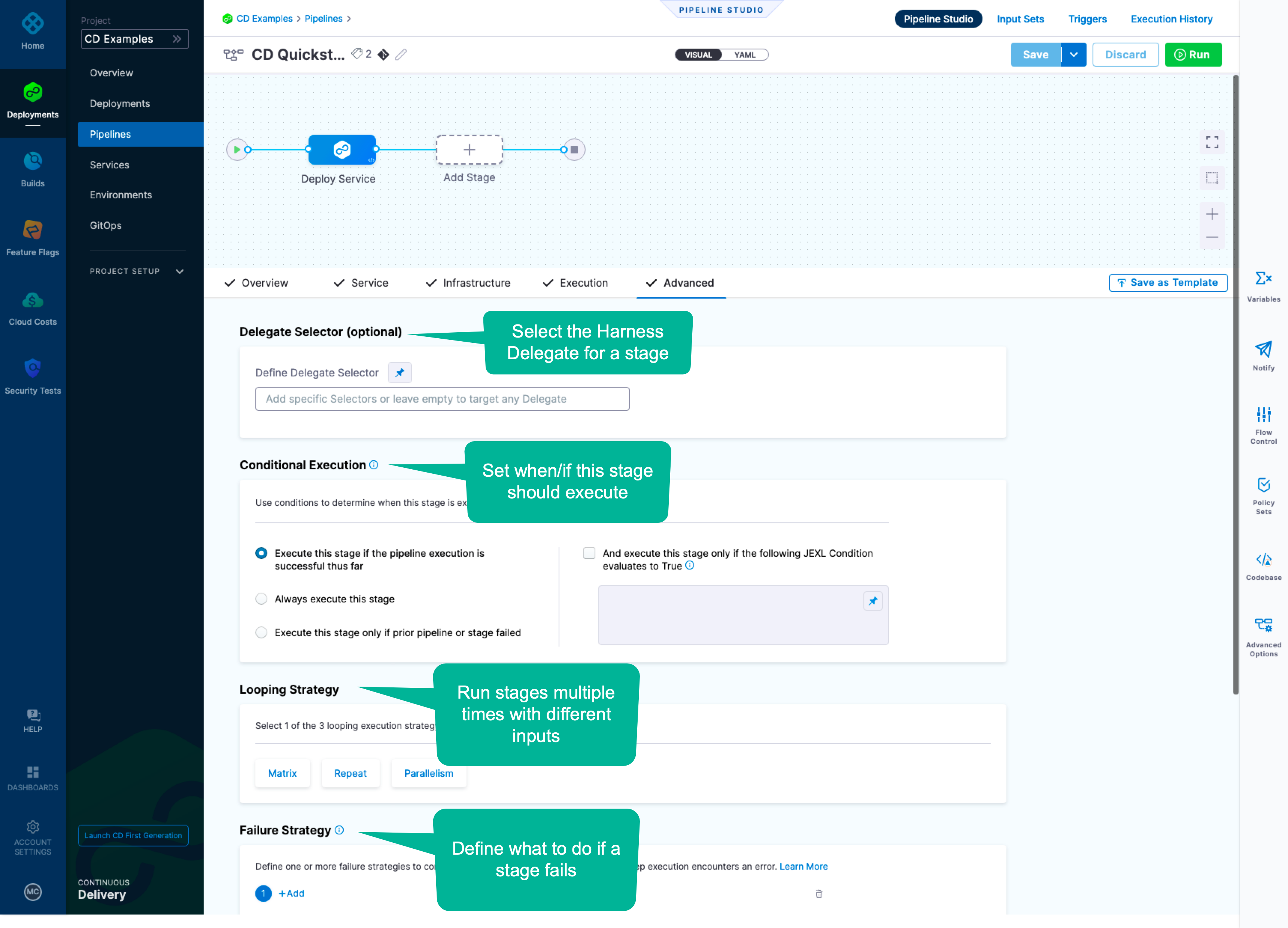In each Stage, you define what you want to deploy using Services, where you want to deploy it using Environments, and how you want to deploy it using Execution steps.