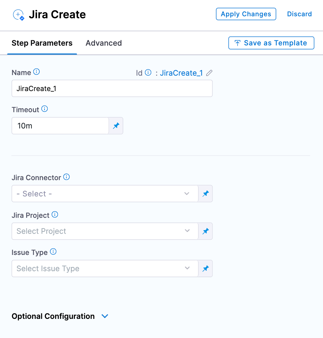 1. In the Jira Create or Update step, select Optional Configuration.