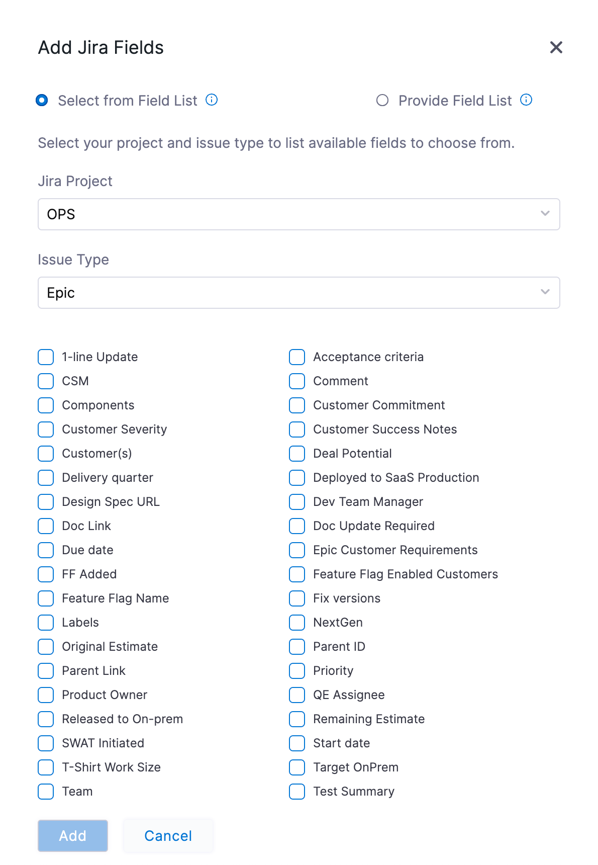 3. In Add Jira Fields, select Parent, and select Add.