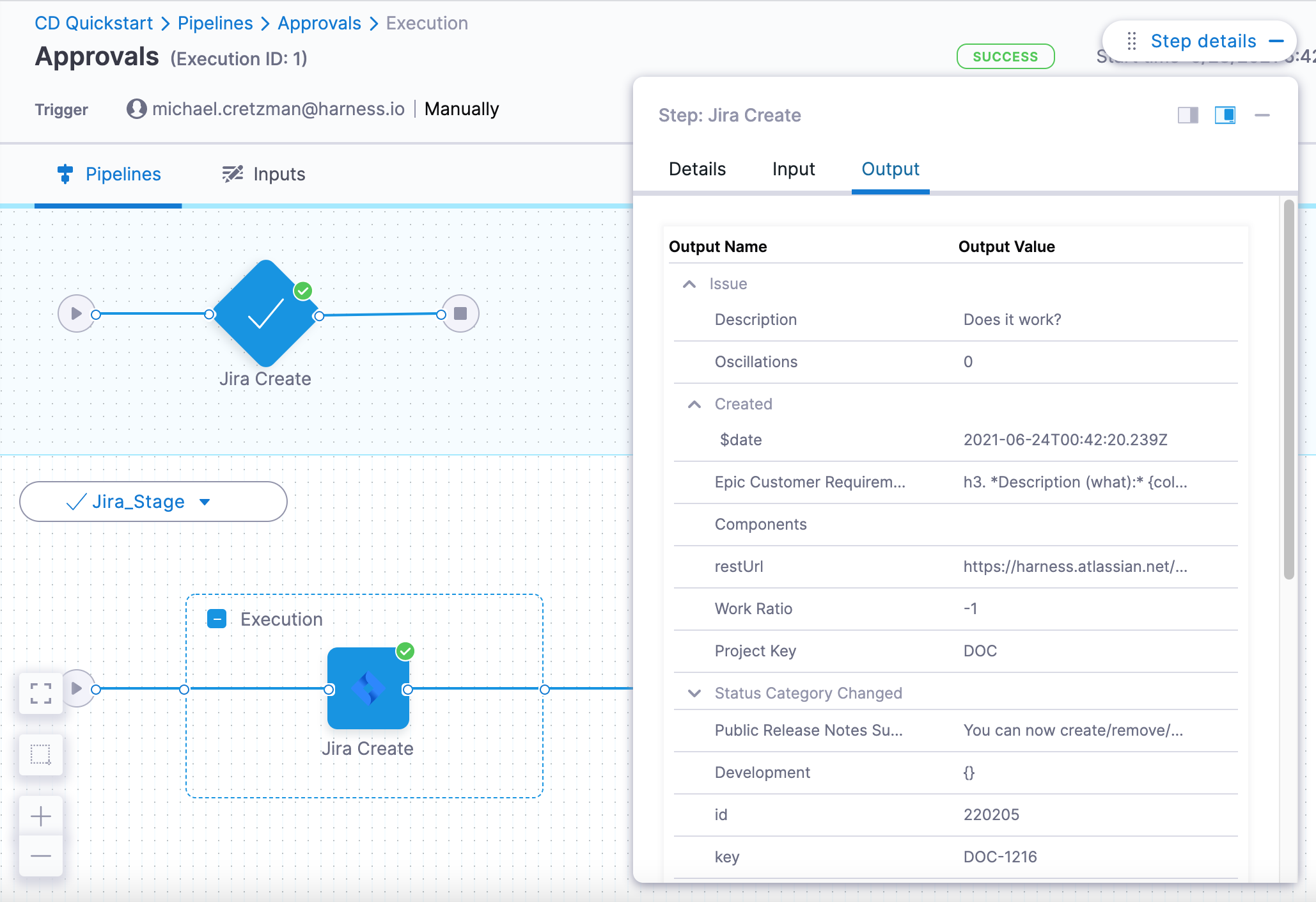 3. In the pipeline execution view, select the Jira Create step, and then select the Output tab. You can view all the fields for the new Jira issue you created.