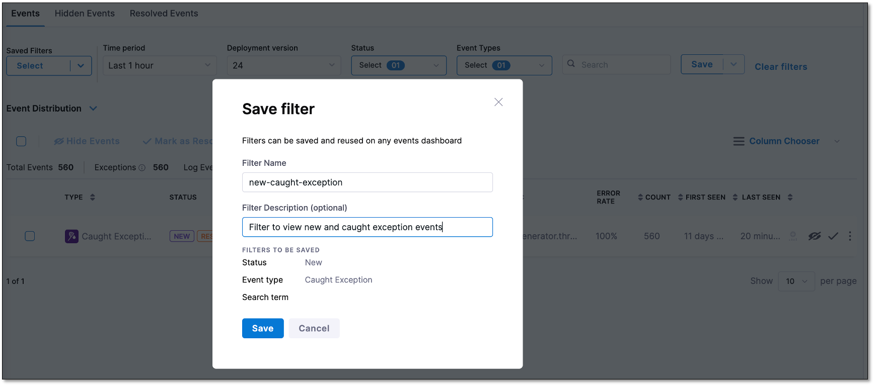 1. On the Events Summary page > Events tab, after configuring the desired filter settings, select Save.