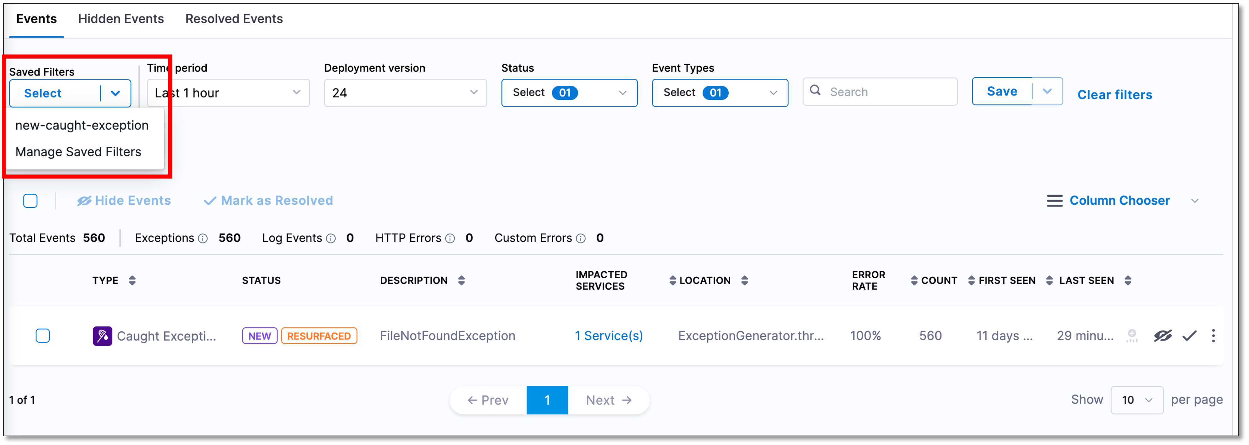 Your filter settings are added to the Saved Filters list. You can view the list by selecting the Saved Filters dropdown.