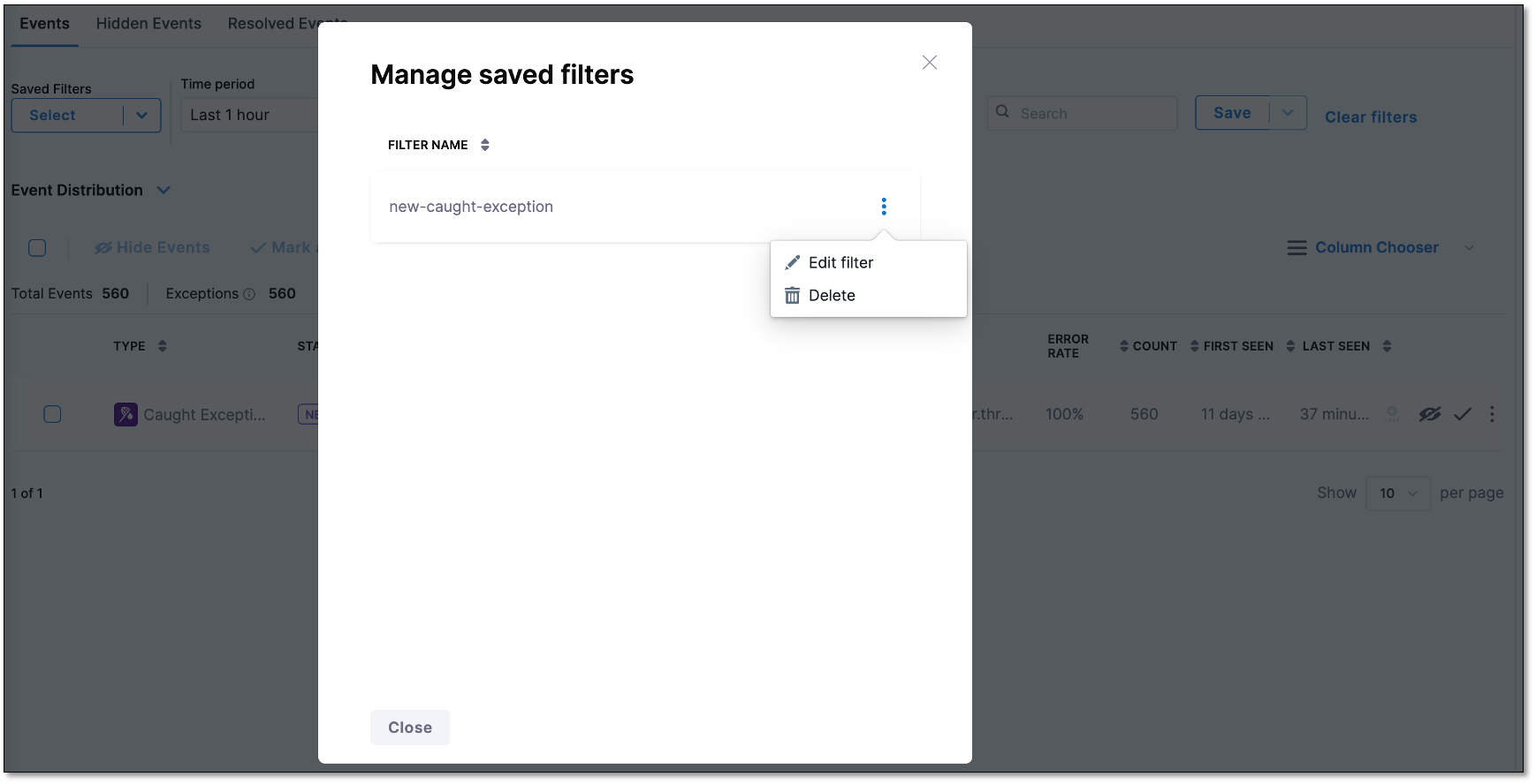 1. From the Saved Filters dropdown, select Manage Saved Filters. The Manage Saved Filters dialog appears, displaying a list of all your saved filters.