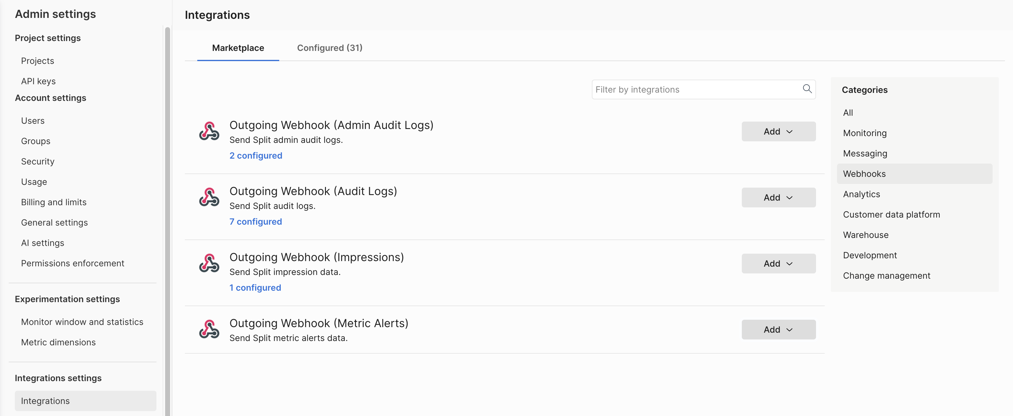 From the Harness FME navigation menu, click FME Settings > Integrations and select Webhooks from the categories menu.