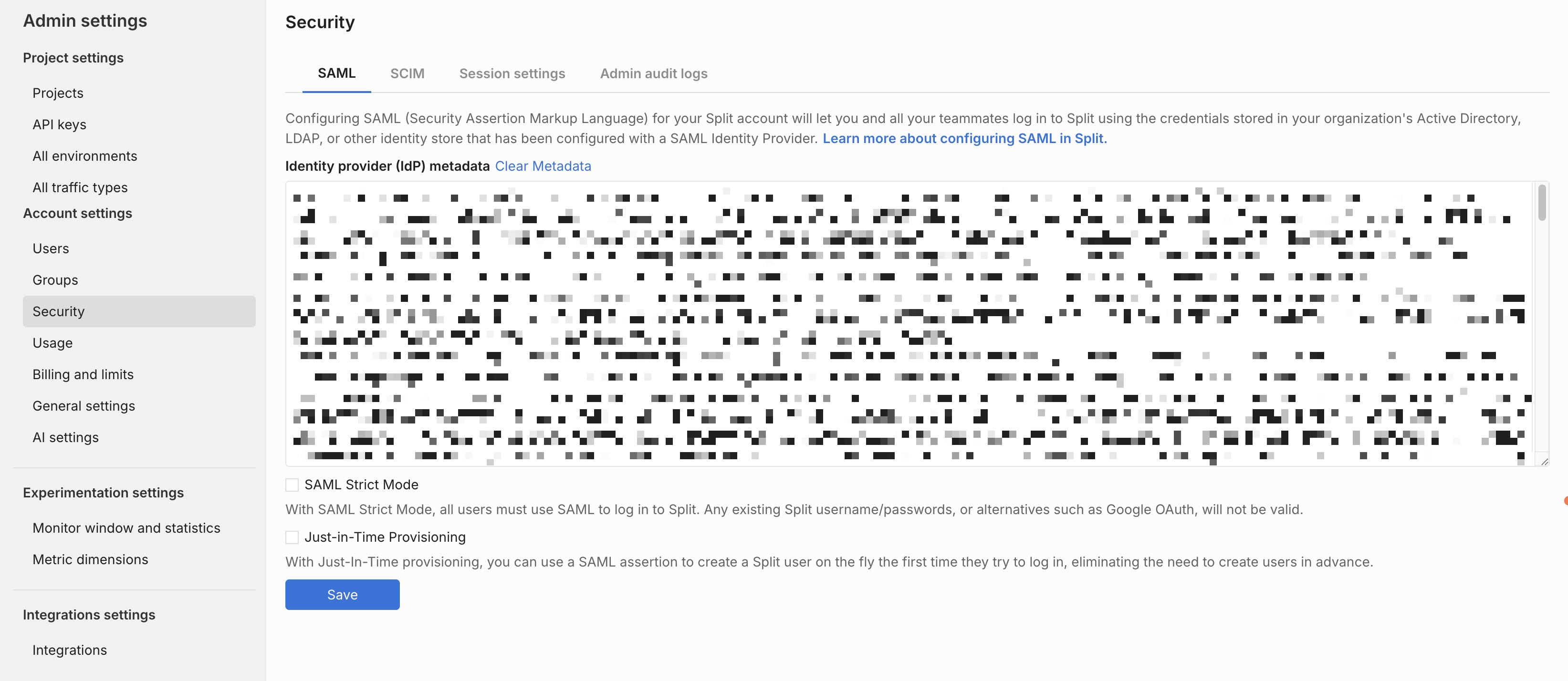 To eliminate the need of creating and inviting users in advance, enable just-in-time provisioning. This provisioning uses a SAML assertion to create a Split user on the fly the first time a new user attempts to log in. New users can still be added through invites via the Admin panel, but in such cases, the user must first complete registration through the invite link before logging into Split through SSO.