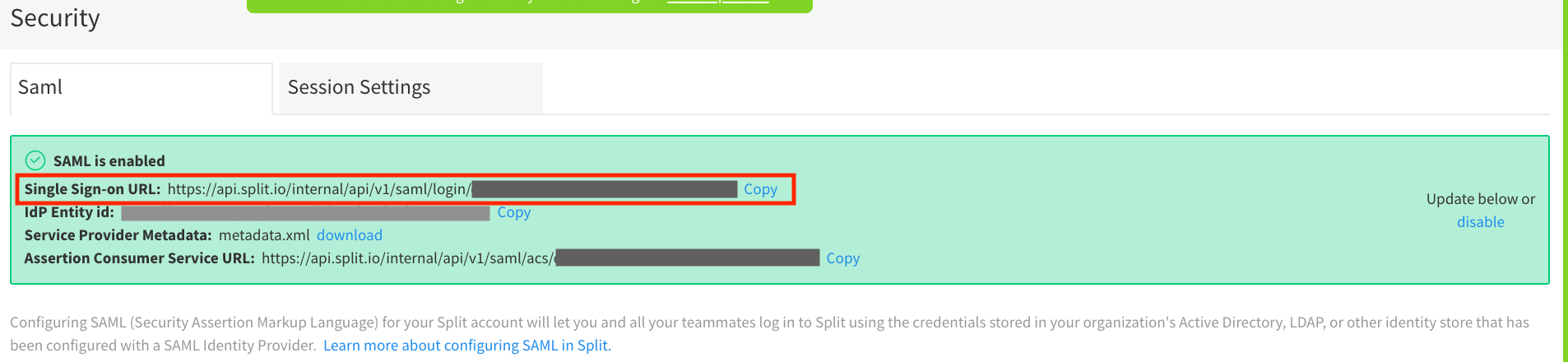 As an alternative to Split’s shortcut in your company’s IdP, users may follow the Single Sign-on URL found on the SAML tab in the Admin panel.