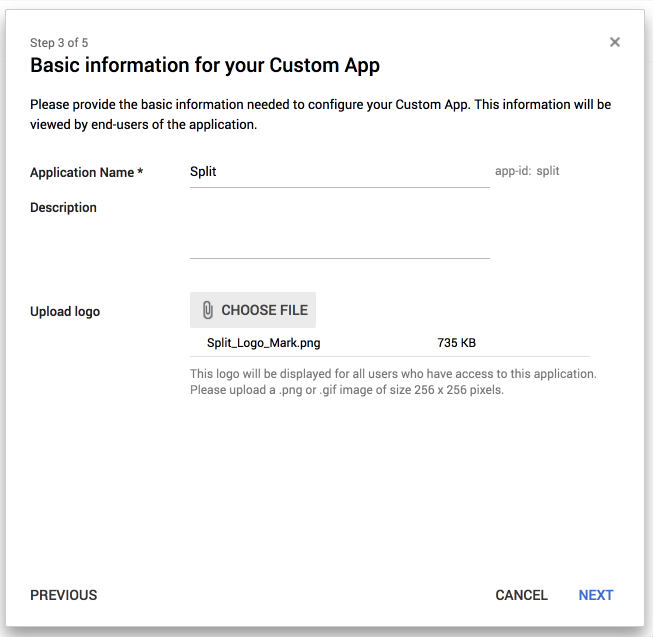 2. Enter the Application Name and Description, add the Split logo, and then click Next.