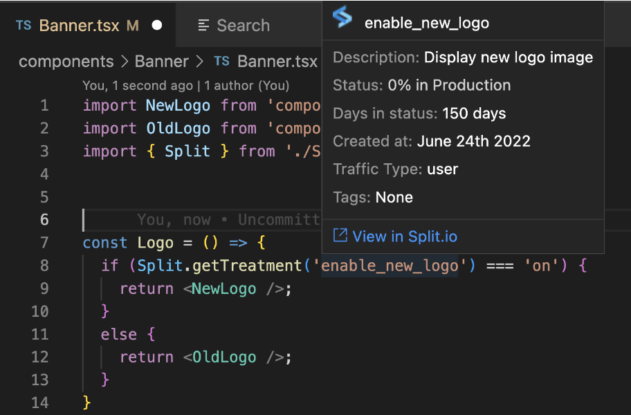 • Recognizes feature flags in code. Within the code itself, you can hover over any strings within quotes and if it recognizes it as a flag from your list, it displays information about the flag, for example, the description, status, traffic type, etc. You can also view it within Harness.