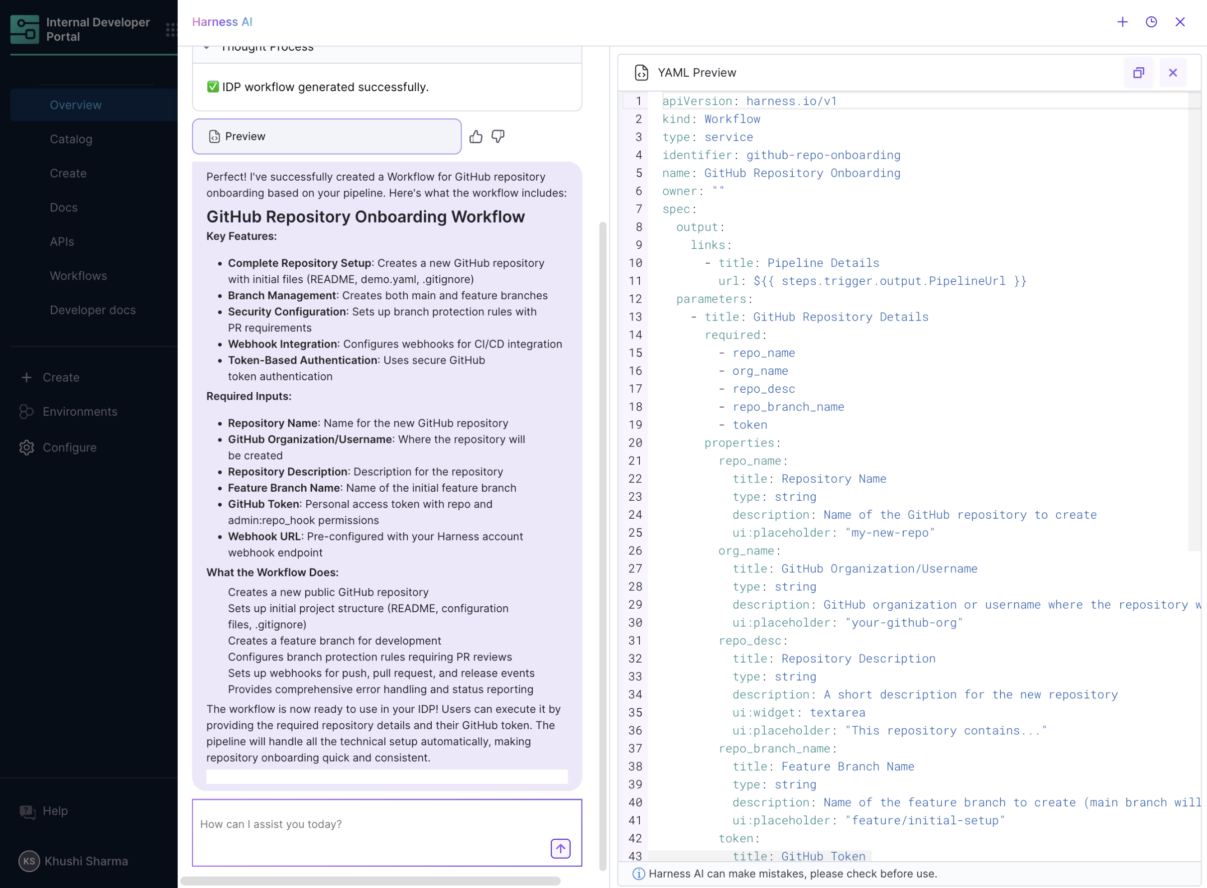 Workflow Help"I want to create a new Harness repo. Is there any IDP workflow for that?"Workflow suggestion + approval workflow trigger
