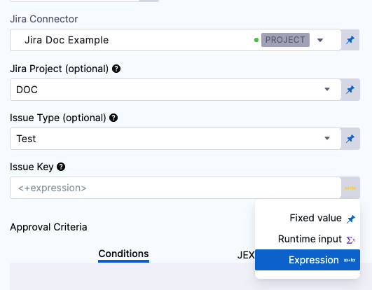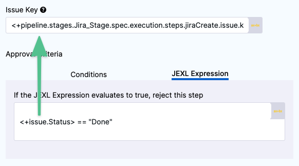For example, <+issue.Status> == "Done" in the Approval Criteria JEXL Expression checks to see in the status of the issue in Issue Key is Done: