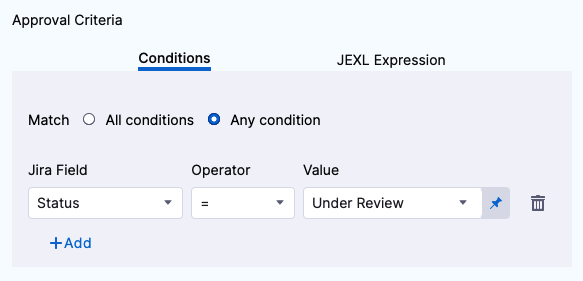 In Conditions, you simply use the Jira Field, Operator, and Value to define approval criteria. Four supported operators are =, !=, in, and not in. For example,