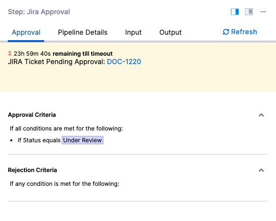 When the Jira Approval step is reached, you can see its approval and rejection criteria: