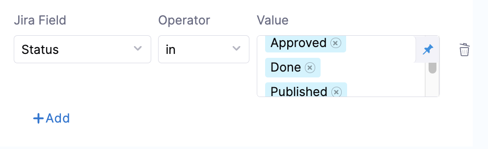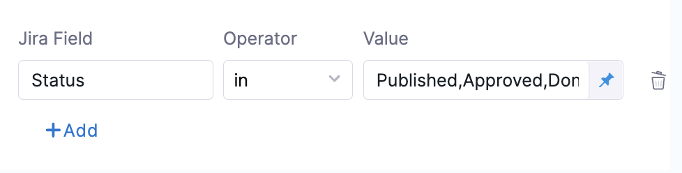 • The condition for the Status field to be in Approved, Done, or Published without Issue Type can be specified as: