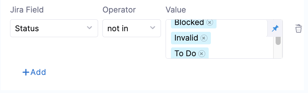 • The condition for the Status field to not be in either Blocked, Invalid, or To Do can be specified as: