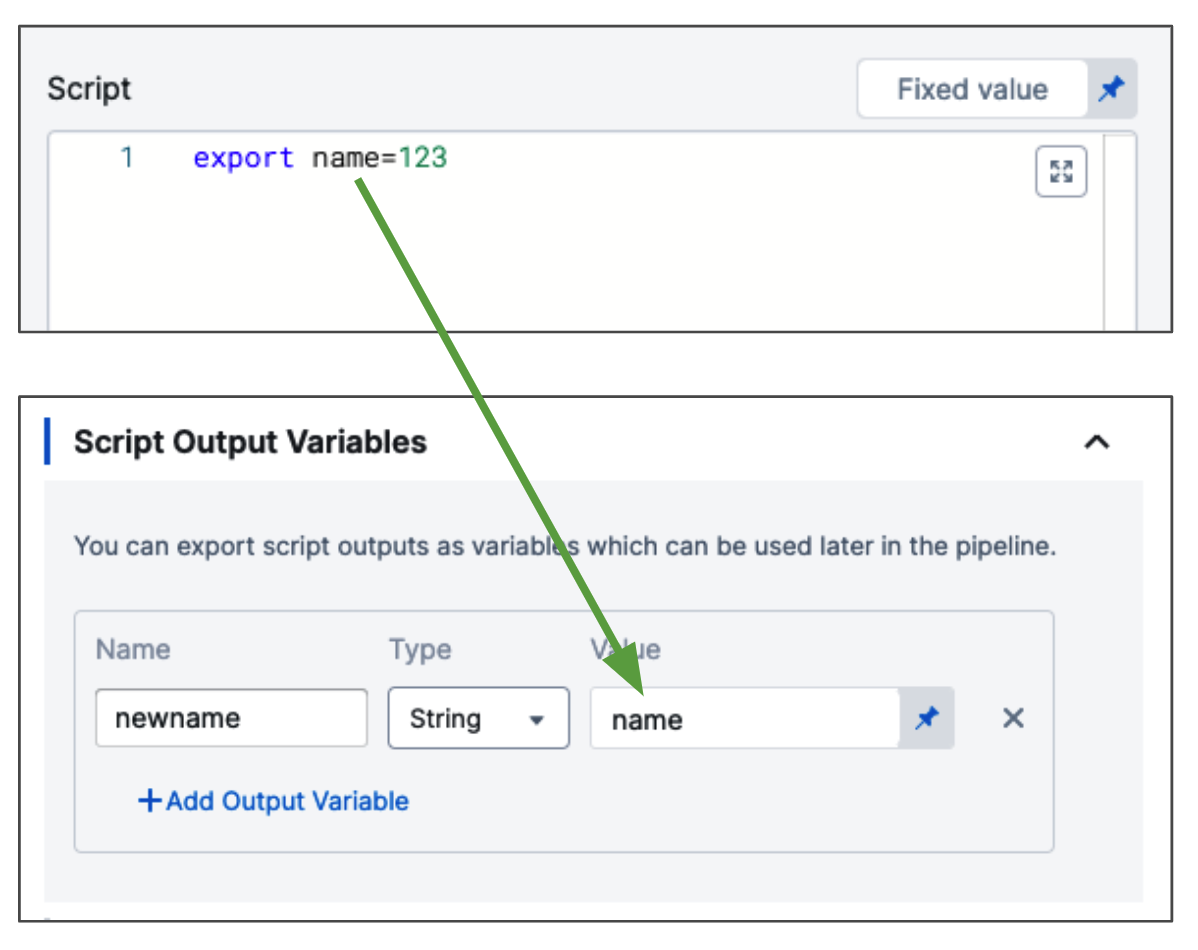 Here's an example showing how the Script Output Variables references the exported variable test, and how you reference the output variable Name var1 in a subsequent Shell Script step to get that value: