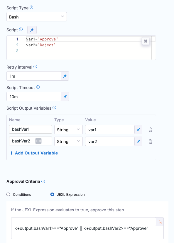 You can also use expressions in Value. For example, if you have an Output Variable from a previous Custom Approval or Shell Script step, you can copy it from the executed step Outputs.