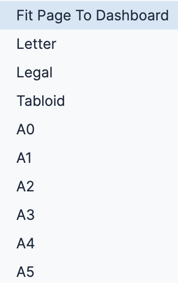 2. Select an option from the Paper Size drop-down menu. The Fit Page to Dashboard option is the default; it sizes the PDF to match the layout of the dashboard on the screen. Other paper size options size the PDF to match a standard paper size and fit the dashboard within it.