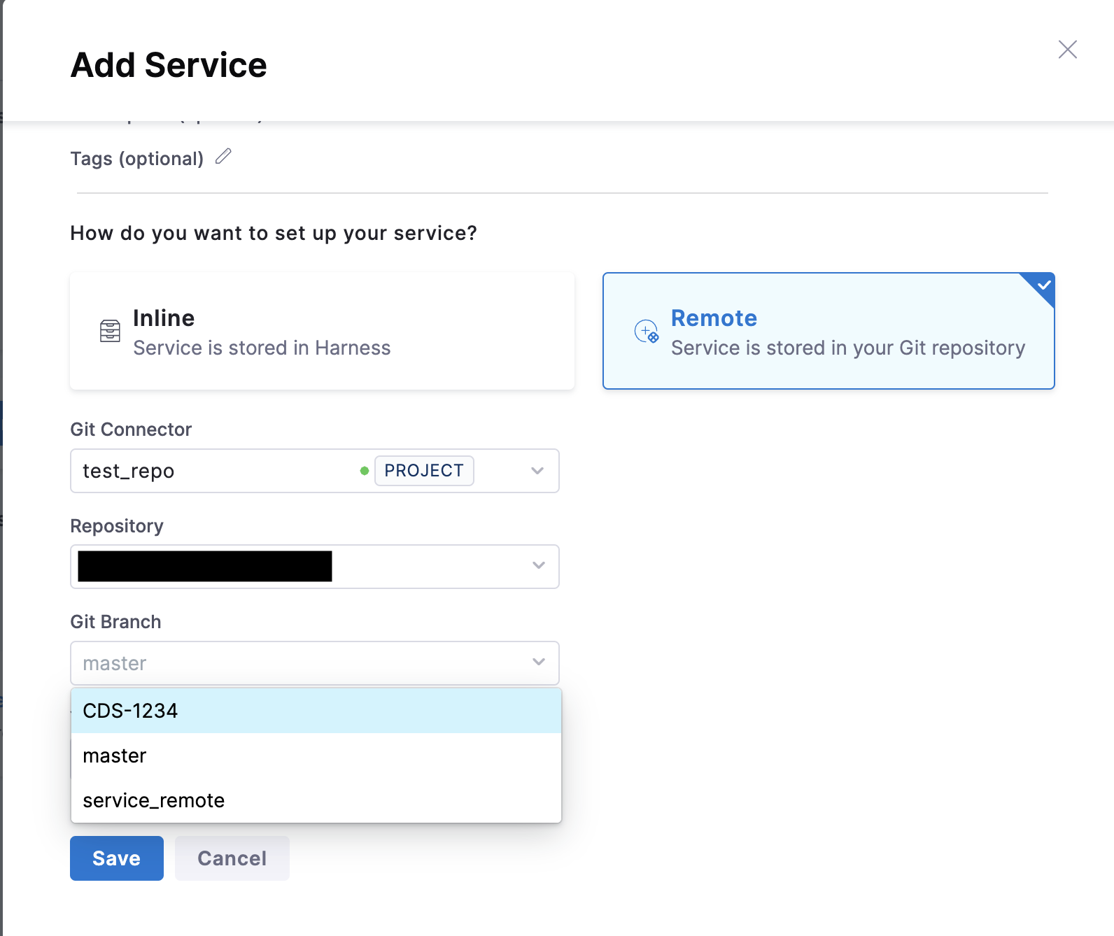 In Git Branch, select a branch. If your branch isn't listed, enter its name. Create the branch in your repository before entering it in Git Branch. Harness does not create the branch for you. Save the service to the default branch on the first save. You can then create different branches in the Harness repo if you want to create different versions of your service.