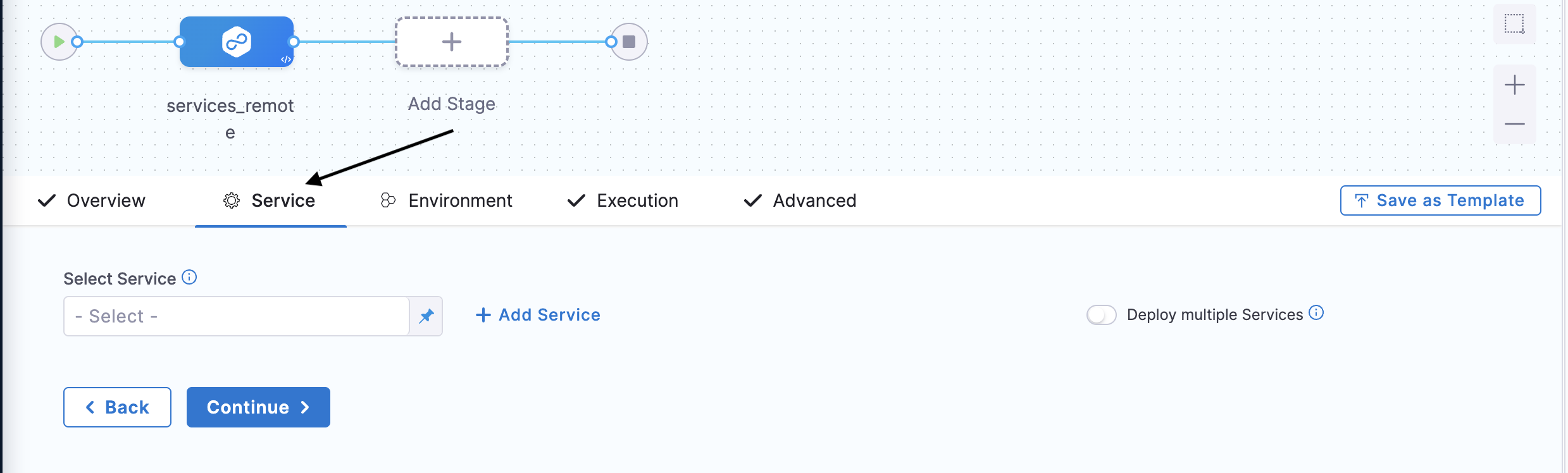 The Deployment Type of the remote service (Kubernetes, ECS, etc.) must match the Deployment Type of the stage where you are adding the service.