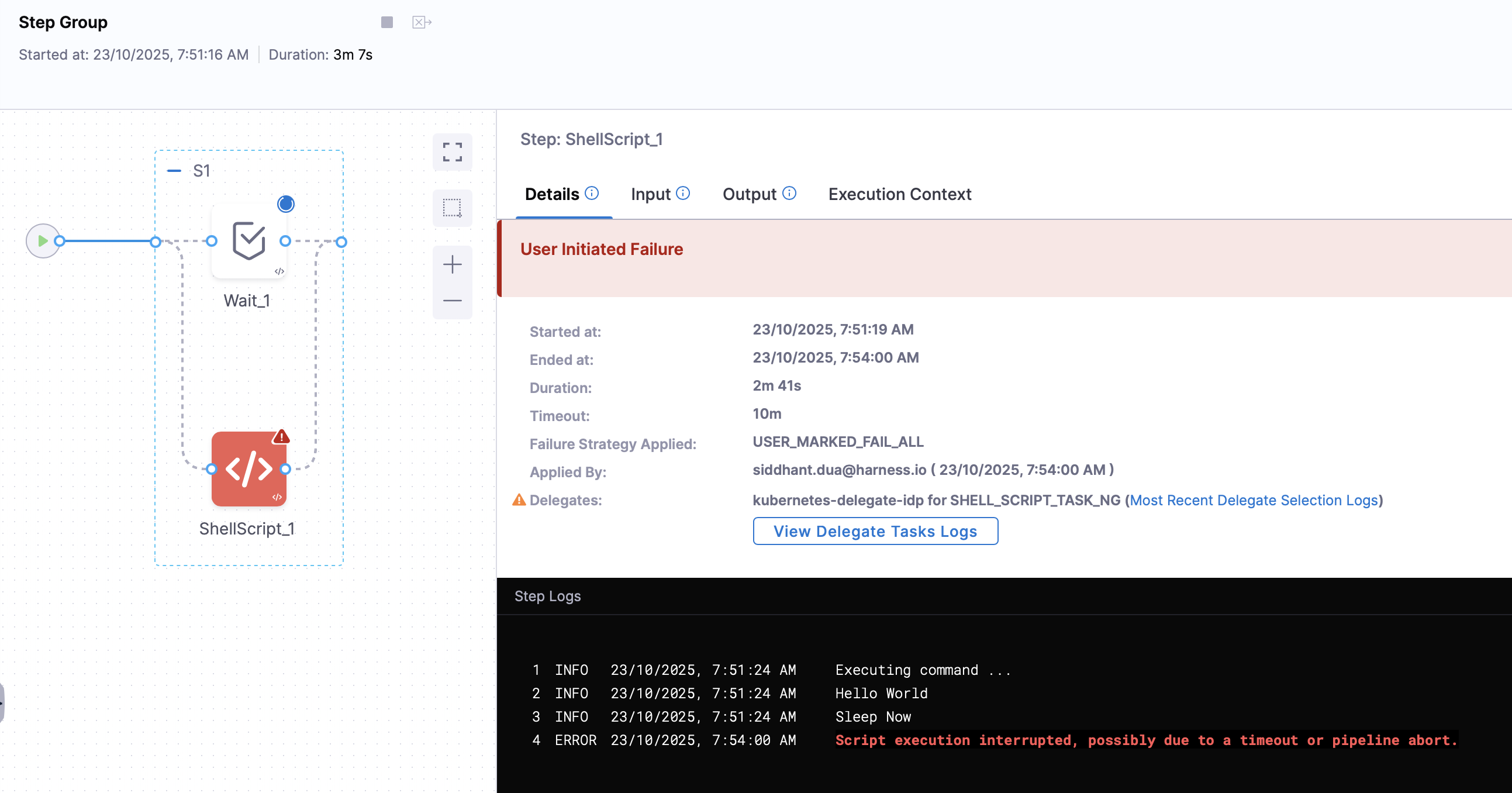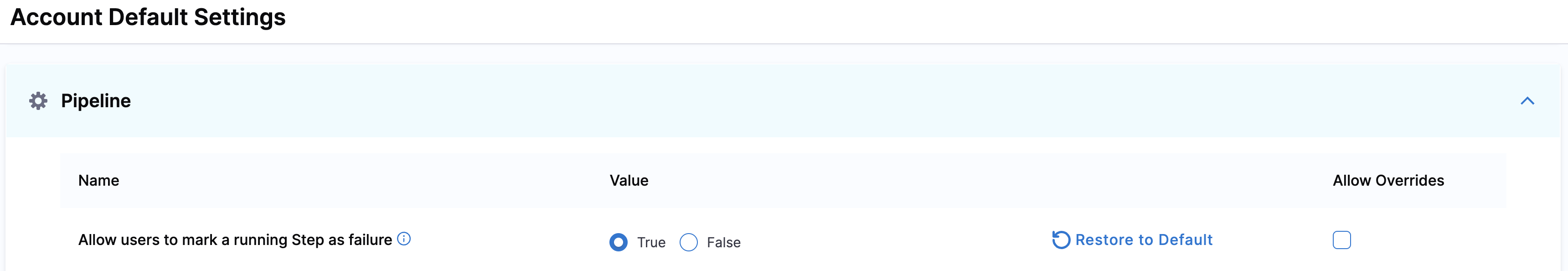 • You must enable Allow users to mark a running Step as failure in your Harness account's default settings.