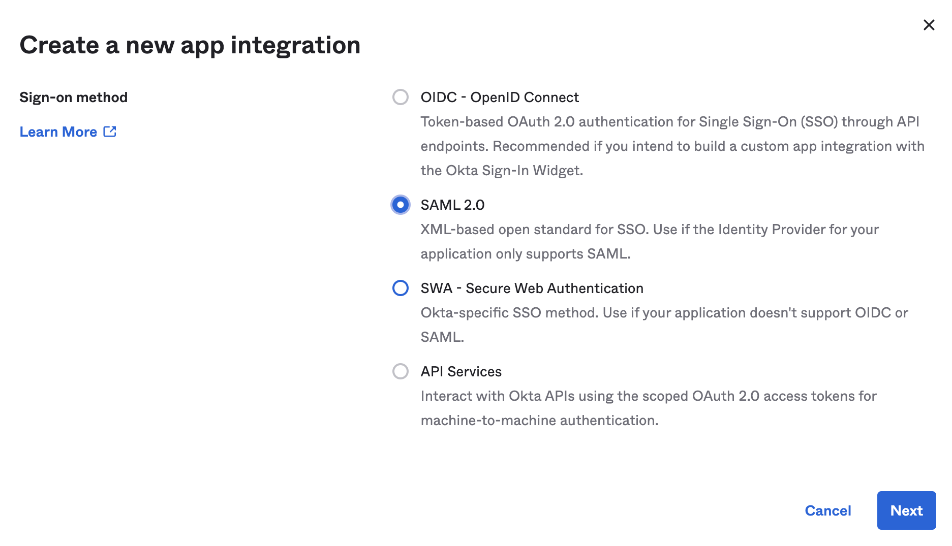 2. On the Create a new app integration page, select SAML 2.0 for the Sign-on Method, and then select Next.