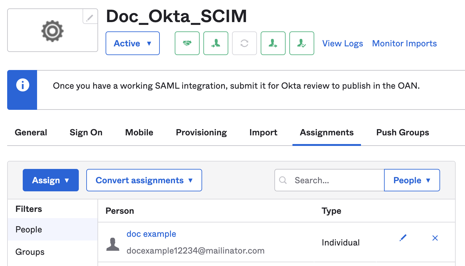 1. In your Harness Okta app, select Assignments.