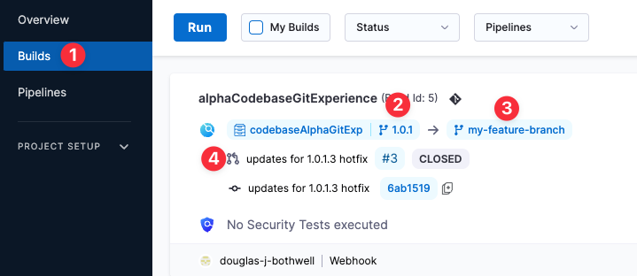 In Harness, view the Pipeline execution. In Harness CI, click Builds (1). You can see the source branch (2), target branch (3), and the pull request comment and number (4).