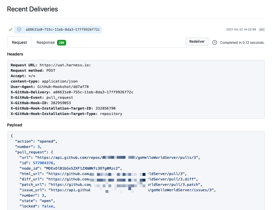 • Check the payloads sent from the Git provider and compare the relevant fields with your trigger conditions. For example, in GitHub you can view the full payload of each event sent from a specific webhook.