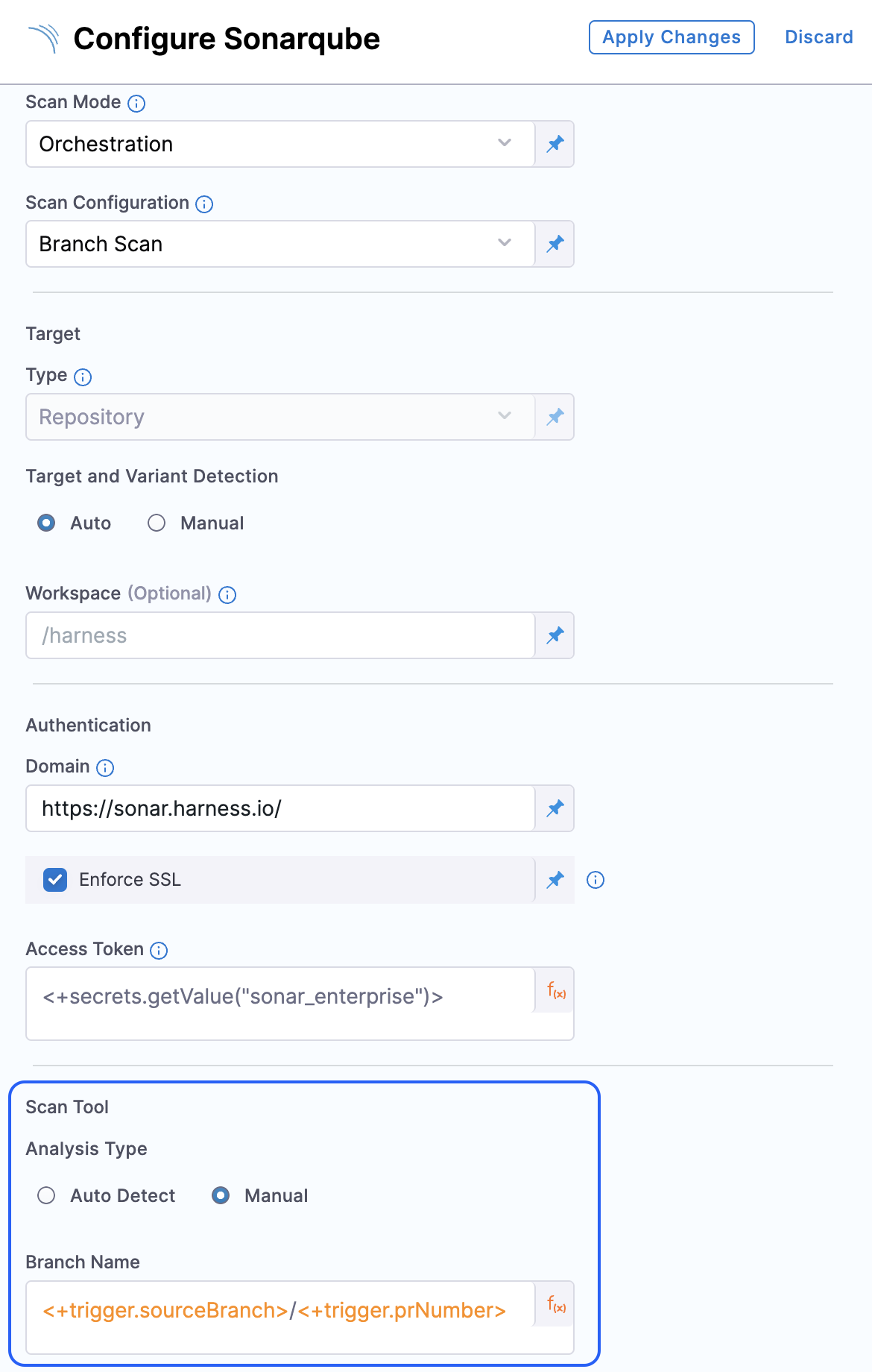 Harness introduced a fix in STO release 1.83.1 to provide better support for orchestrated branch and pull-request scanning with SonarQube Enterprise.
