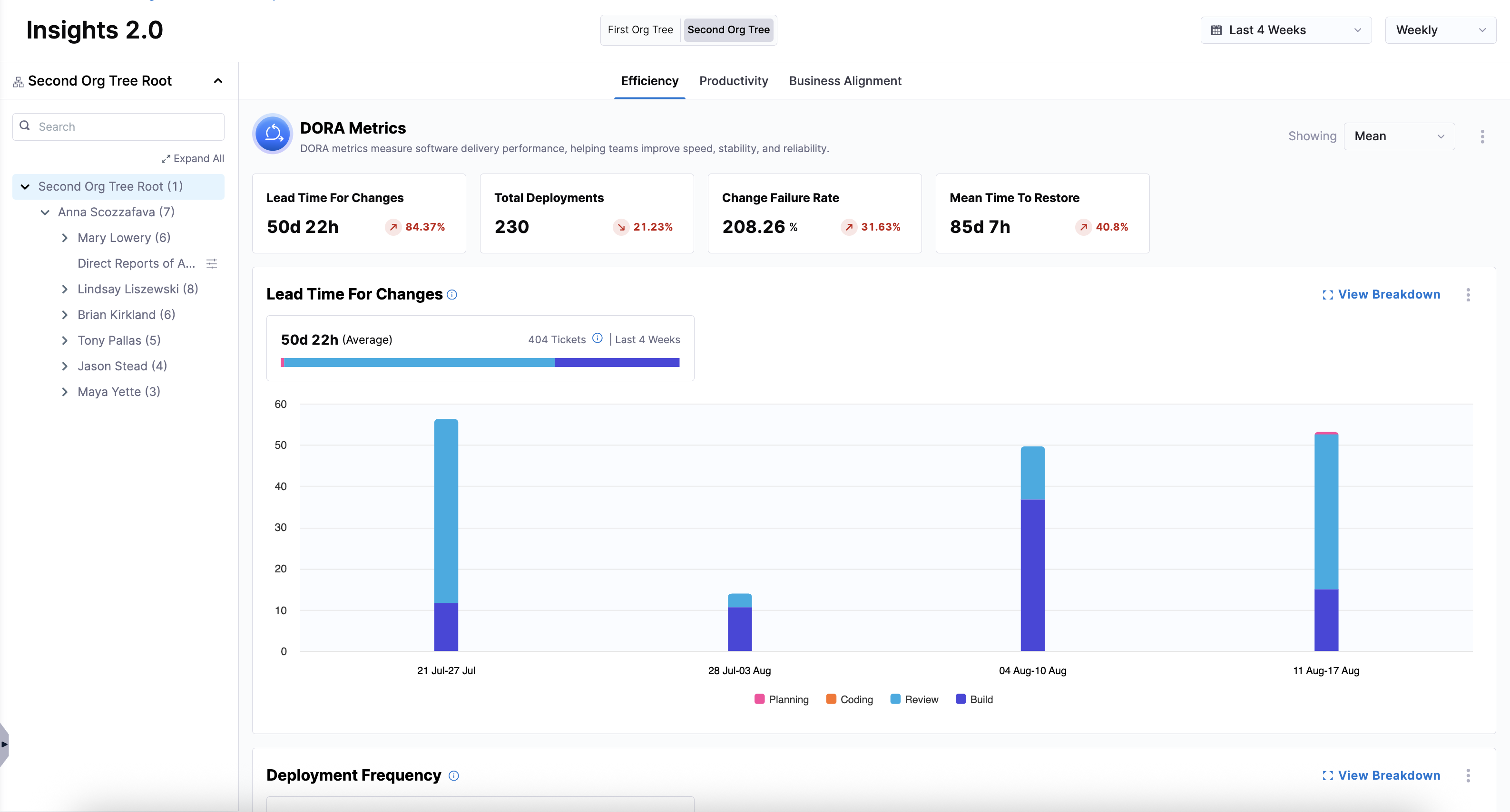 You can interact with the graphs to see breakdowns by stages (Planning, Coding, Review, Build, or Deployment) or by team.