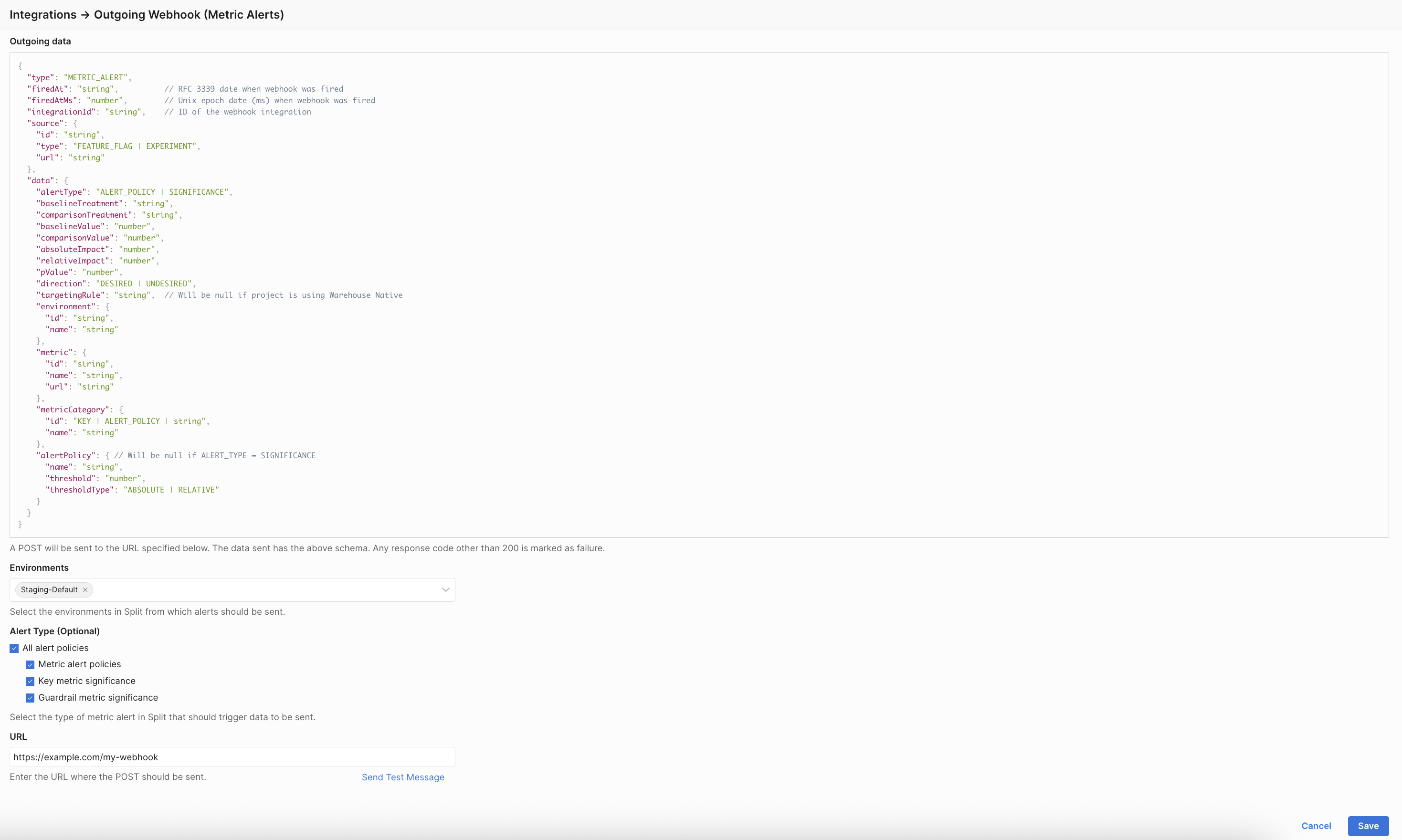 The Metric Alert Webhook enables teams to automatically forward metric alert notifications (including alert policy degradations, key metric significance, and guardrail significance alerts) to any external system through a configurable HTTP POST webhook. This webhook enables real-time automation and enables a tighter integration with your incident management, analytics, and CI/CD tools.