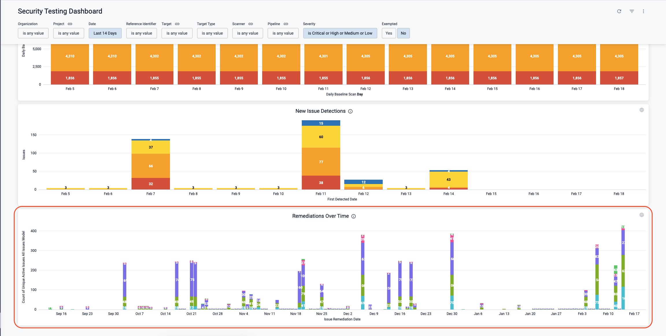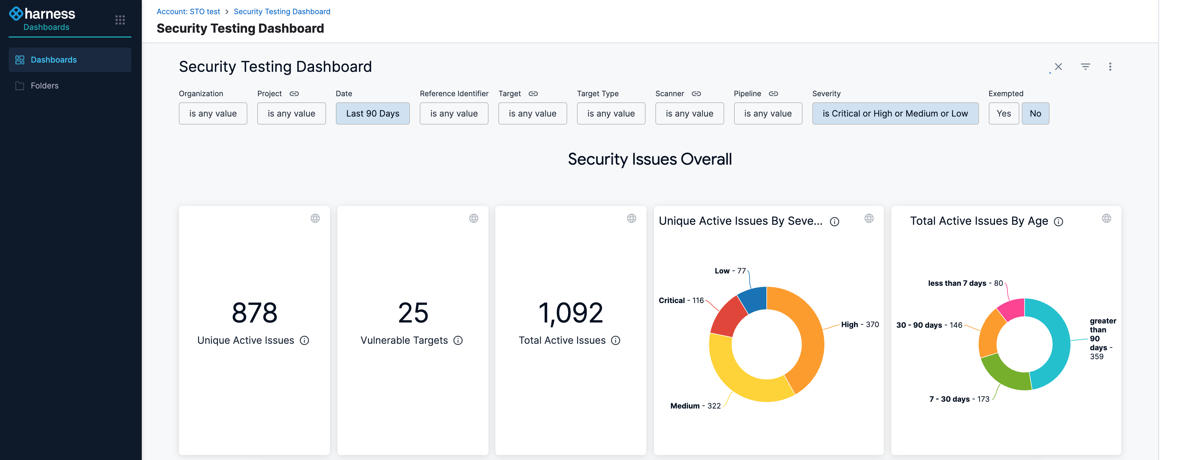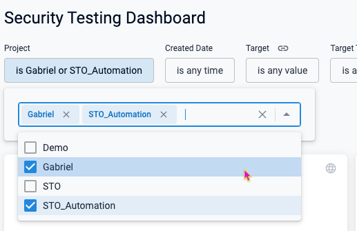 • The Security Testing Dashboard includes a new set of filters for drilling down into specific issues by project, creation date, scanner, target, pipeline, severity, and so on. You can drill down to a set of relevant issues and then click on a pie slice, chart element, or other UI element to view details on the relevant issues. (STO-5329)