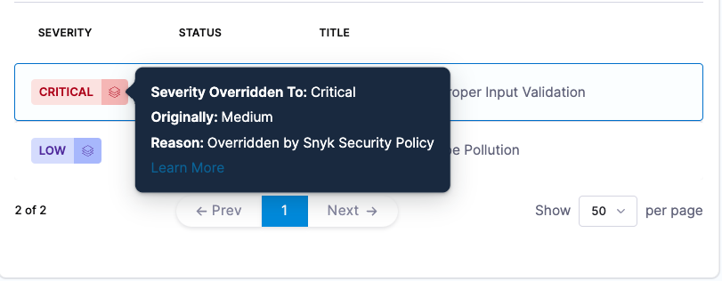 • Updated severity override logic in the Vulnerabilities tab to correctly reflect changes. For example, when a severity is overridden from medium to low by Snyk, the UI now displays the correct direction of the override (STO-9483).