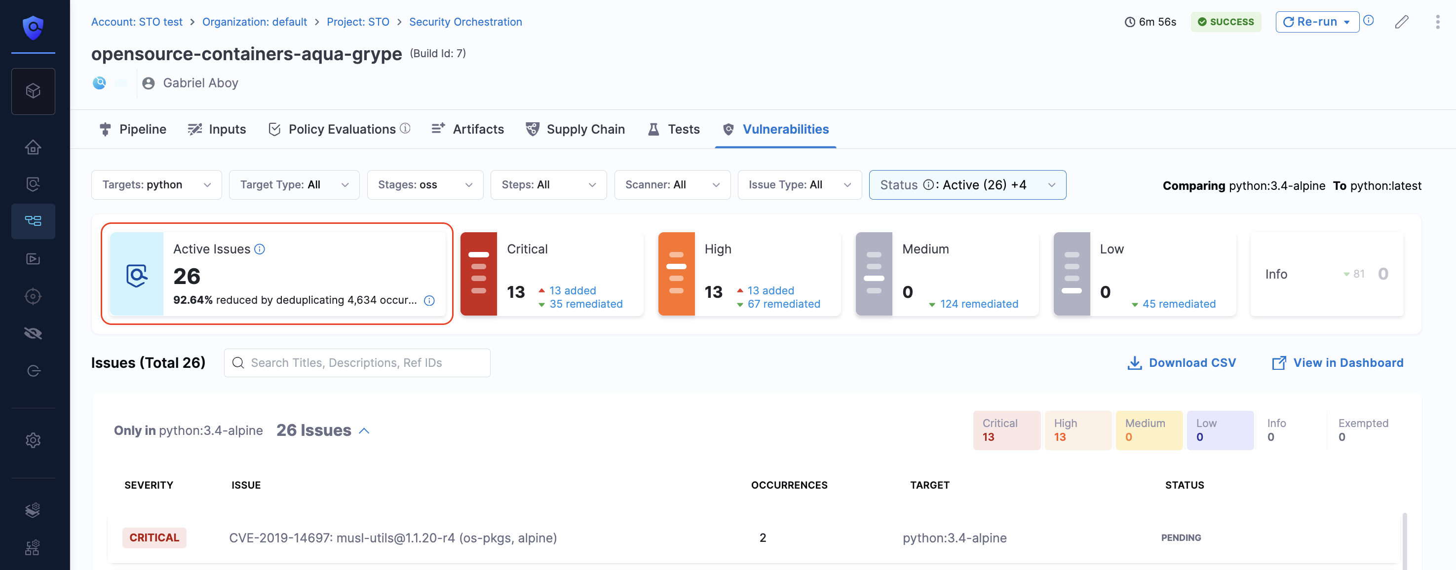 • Fixed a bug in the Vulnerabilities tab where applying a filter by Status affected the overall severity counts incorrectly. Severity counts now reflect accurate data irrespective of applied filters (STO-9548).