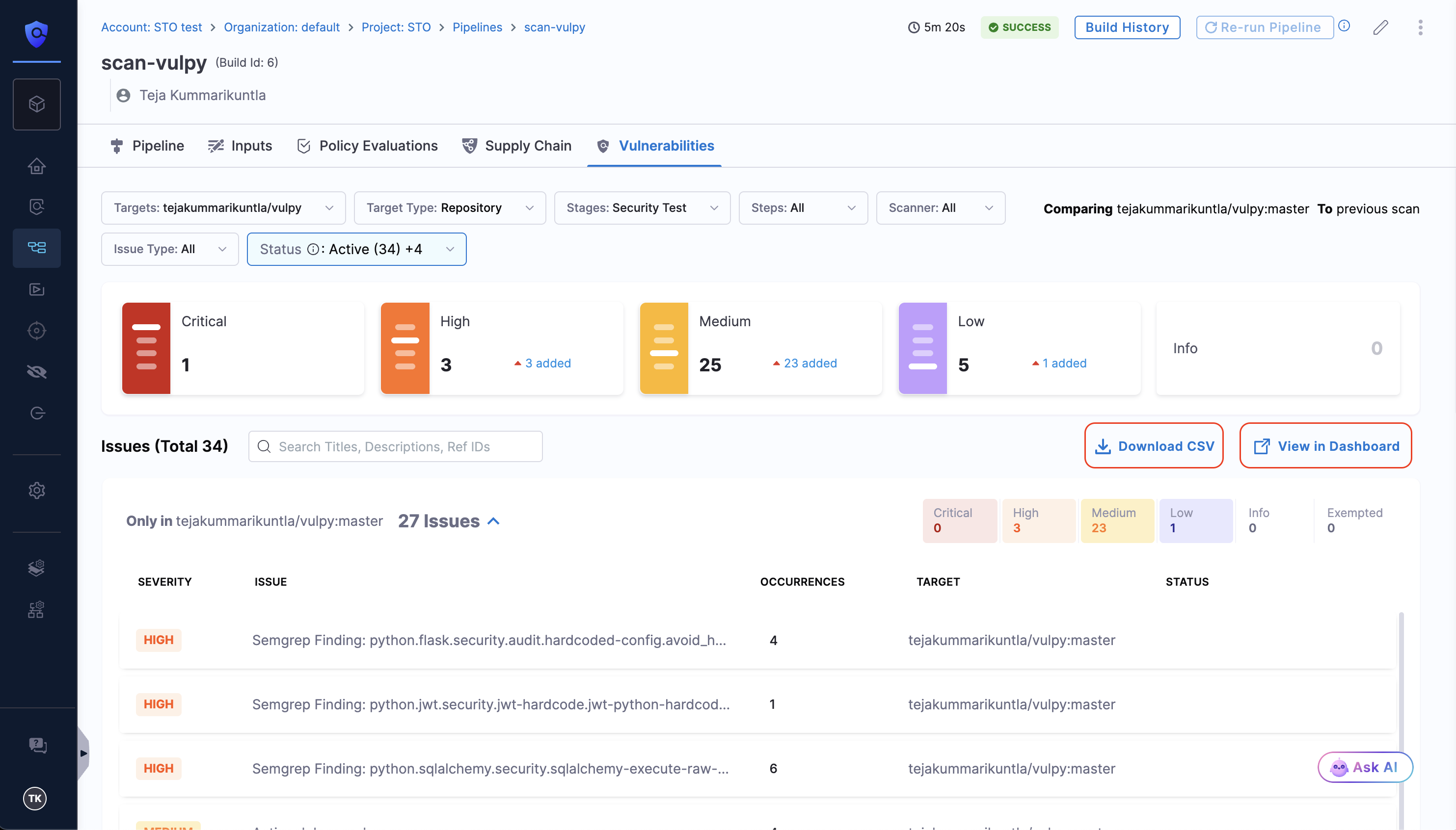 • Navigate to the Pipeline Execution Summary Dashboard from the same tab to export results in CSV or PDF. Refer to Export Scan Results Documentation for more details.