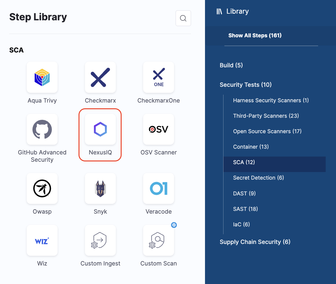 Nexus IQ is now available as a native step. Previously supported only through the Custom Scan step, you can now use the Nexus IQ native step for all scans. Refer to the Nexus IQ documentation for more details.